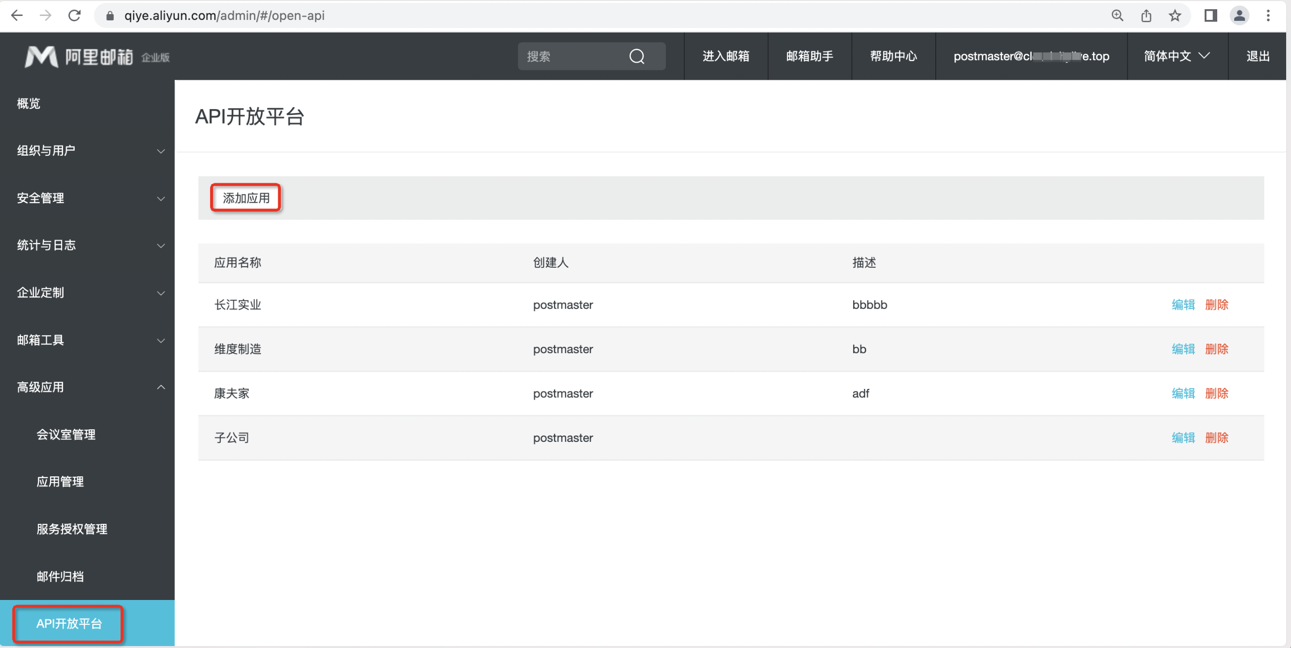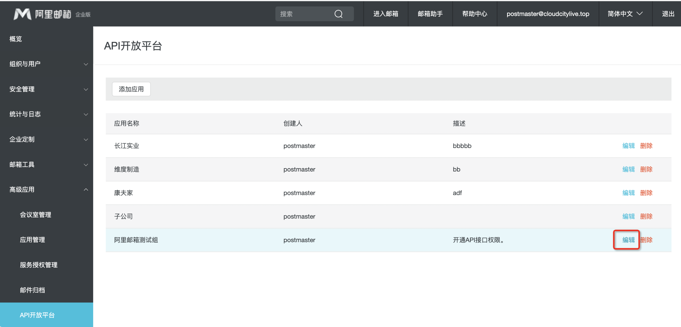阿里邮箱新版API接口的申请已更新为管理员自助申请啦!原来通过发送邮件方式申请Accesscode&Password的方式变更为邮箱管理员自助即可开通,可极大的缩短API申请用时,管理员自助申请API接口操作如下:
