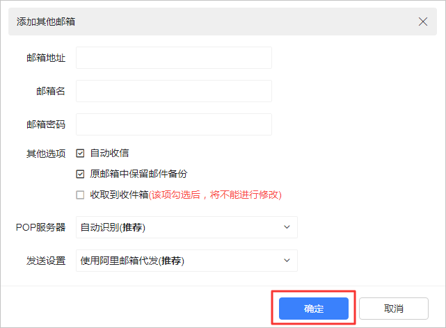 3、在添加其他邮箱窗口中,输入希望代收的邮箱地址、邮箱名和邮箱密码,POP服务器设置自动识别(推荐),发送设置选择使用阿里邮箱代发(推荐),单击确定。