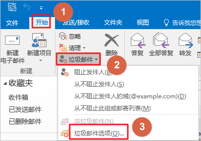 1、打开Outlook,依次单击开始>垃圾邮件>垃圾邮件选项。