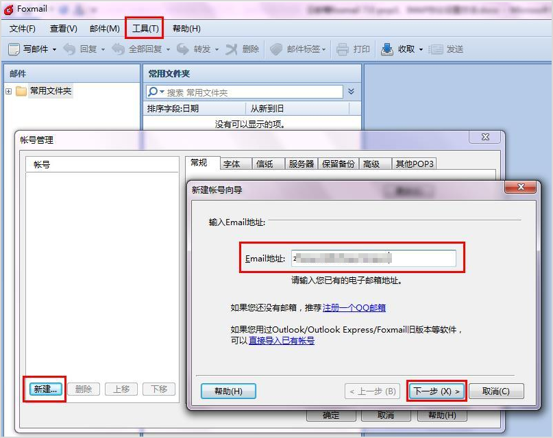 进入Foxmail客户端,单击工具>账号管理,然后在页面中单击新建,弹出新建账号向导窗口。