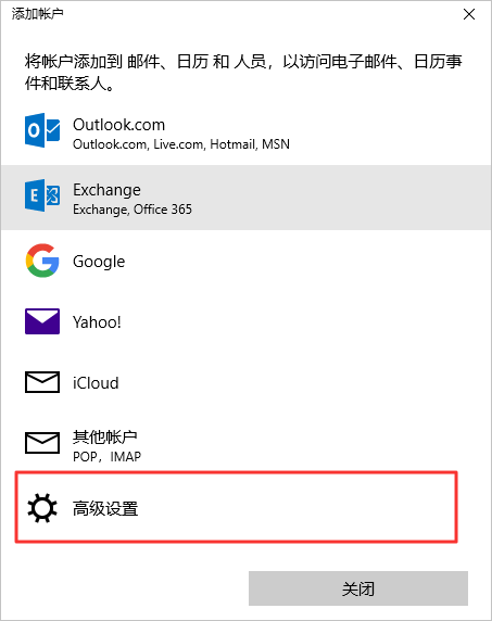 在进行设置前,请确认POP3/SMTP和IMAP/SMTP服务已开启,关于如何开启服务,请参见Outlook和Foxmail中配置阿里邮箱时一直提示密码错误的解决方案。以下是阿里邮箱在Windows 10系统的邮件客户端中对POP3和IMAP协议的设置方法: 1、启动Windows10系统的邮件客户端,在添加帐户页面,单击高级设置。 2、单击Internet电子邮件。 3、在Internet电子邮件帐户页面,输入电子邮件地址、用户名、密码等选项。 说明 建议勾选SSL加密设置,邮件收发更安全。 a. 邮件地址:输入您完整的阿里邮箱地址 (如a***@example.net)。 b. 用户名:输入您完整的邮箱地址(如a***@example.nea***@example.net)。 说明 用户名请输入完整邮箱地址。 c. 密码:输入您的客户端密码。 d. 帐号名:输入邮箱账号。 e. 服务器信息。 接收邮件服务器:pop.qiye.aliyun.com或者pop3.[$Domain]。 发送邮件服务器:smtp.qiye.aliyun.com或者smtp.[$Domain]。 说明 [$Domain]为您想要设置的域名,如果您需要使用自己的域名,需要配置对应的DNS解析,建议您使用阿里邮箱官方服务地址,否则配置无法生效。如何配置DNS解析请参见 阿里邮箱域名解析。 接收邮件服务器:imap.qiye.aliyun.com或者imap.[$Domain]。 发送邮件服务器:smtp.qiye.aliyun.com或smtp.[$Domain]。 4、设置完成后,单击登录,系统显示类似如下,说明设置完成,单击完成即可。详细信息