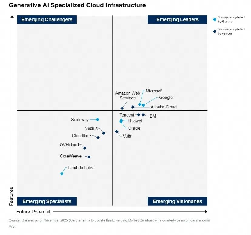 在“面向GenAI的基础设施”的维度,报告关注云厂商面向模型训练、推理和服务所提供的基础设施优化。新兴领导者象限仅有阿里云四家厂商入围,阿里云是唯一入围亚太厂商。