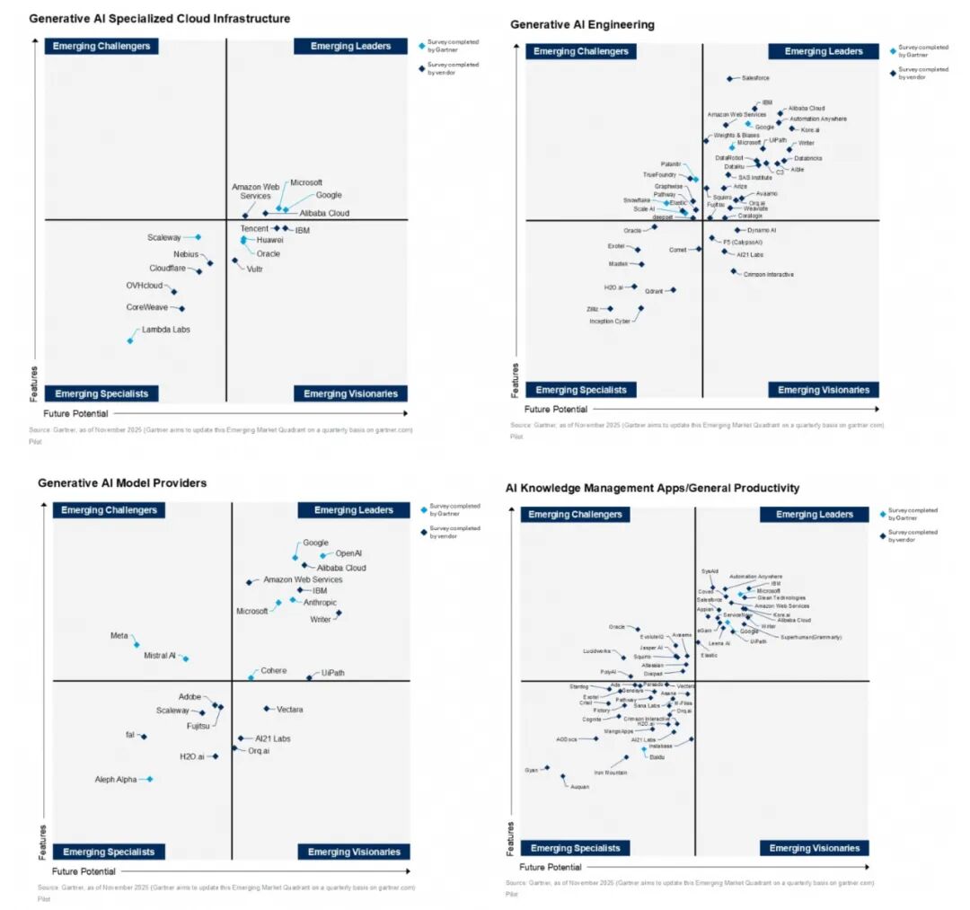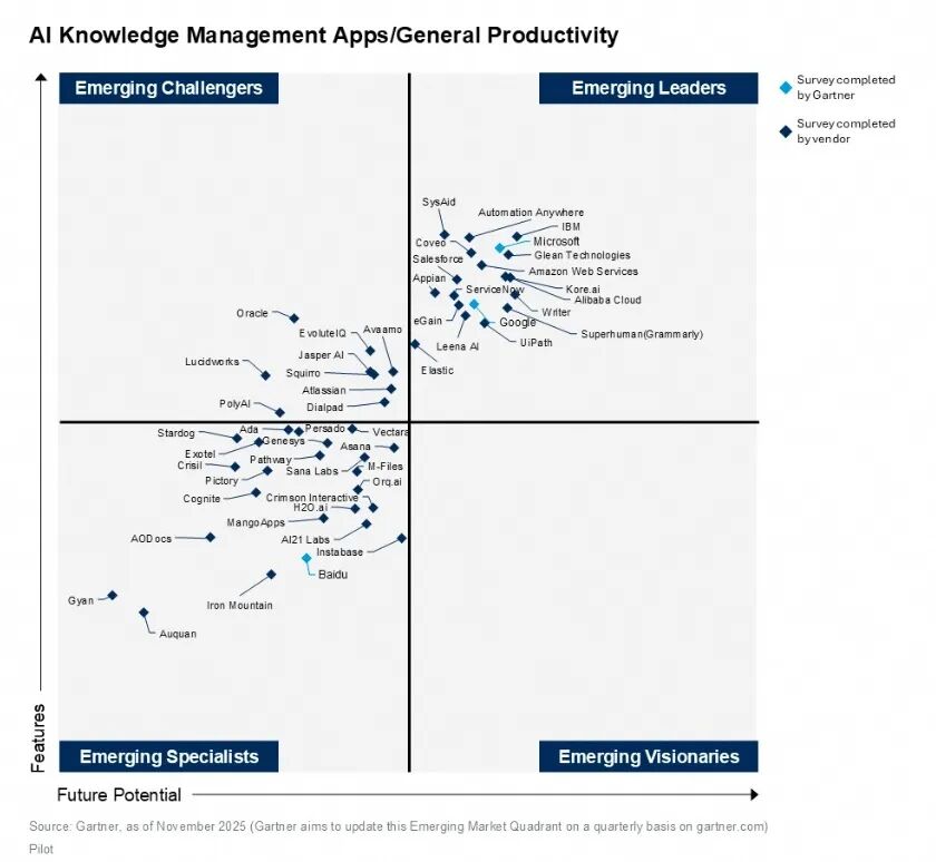 在“AI知识管理应用/通用生产力”维度,报告的评测范围覆盖企业级 AI 搜索、对话式 AI 平台,以及用于沟通和内容开发的生产力工具。阿里云依然处于新兴领导者象限,且是中国唯一。