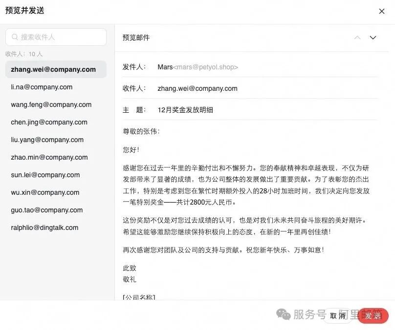 一键群发,实时追踪:确认无误后点击发送,系统自动为每位收件人生成独立邮件。整个过程无需离开钉钉,5分钟即可完成以往需跨3个平台的操作。