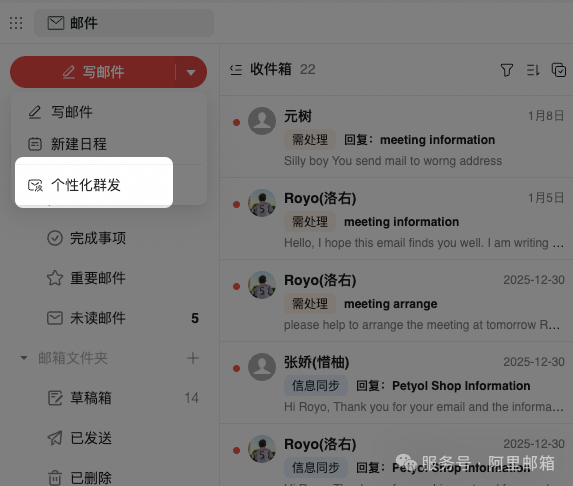个性化群发(mail merge )是指在一次群发操作中,通过预设变量(如姓名、公司、职位、订单号等),自动为每位收件人生成专属内容的邮件。例如: