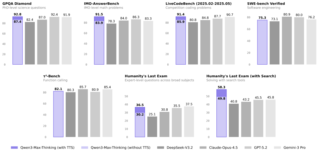 在关键的模型推理能力提升中,千问新模型采用了一种全新的测试时扩展(Test-time Scaling)机制,推理性能提升的同时还更经济。 业界普遍的推理时计算,只会简单增加并行推理路径,重复推导已知结论很常见,冗余推理效率低下;而千问采用的这一机制,可对此前推理的结果进行“经验提取”式的提炼,并据此进行多轮自我迭代,在相同的上下文中实现更高效的推理计算,因此获得更智能的推理结果。 基于这一推理技术创新,千问推理性能和推理效率大为提升,比如在启用工具的“人类最后的测试”HLE中,千问得分58.3,大幅超过GPT-5.2-Thinking的45.5、Gemini 3 Pro的45.8,录得当前所有模型的最高分。 # 大幅增强原生Agent能力,对话时自主调用工具 面向即将到来的智能体Agent时代,Qwen3-Max-Thinking还大幅增强了自主调用工具的原生Agent能力。 这种自适应的工具调用能力可在QwenChat上完整体验,Qwen3-Max-Thinking模型会自主选用「搜索」、「个性化记忆」和「代码解释器」等三个核心的Agent工具功能,提供专业人士一样水平的回答,更合用户心意、更智能、更流畅;同时,模型幻觉也大为降低,为解决真实复杂任务打下基础。 该能力源自于通义团队专门设计的训练流程。具体而言,在完成初步的工具使用微调后,团队对模型进一步在大量多样化任务上进行了基于规则奖励与模型奖励的联合强化学习训练,使得Qwen3-Max-Thinking拥有更智能结合工具进行思考的能力。