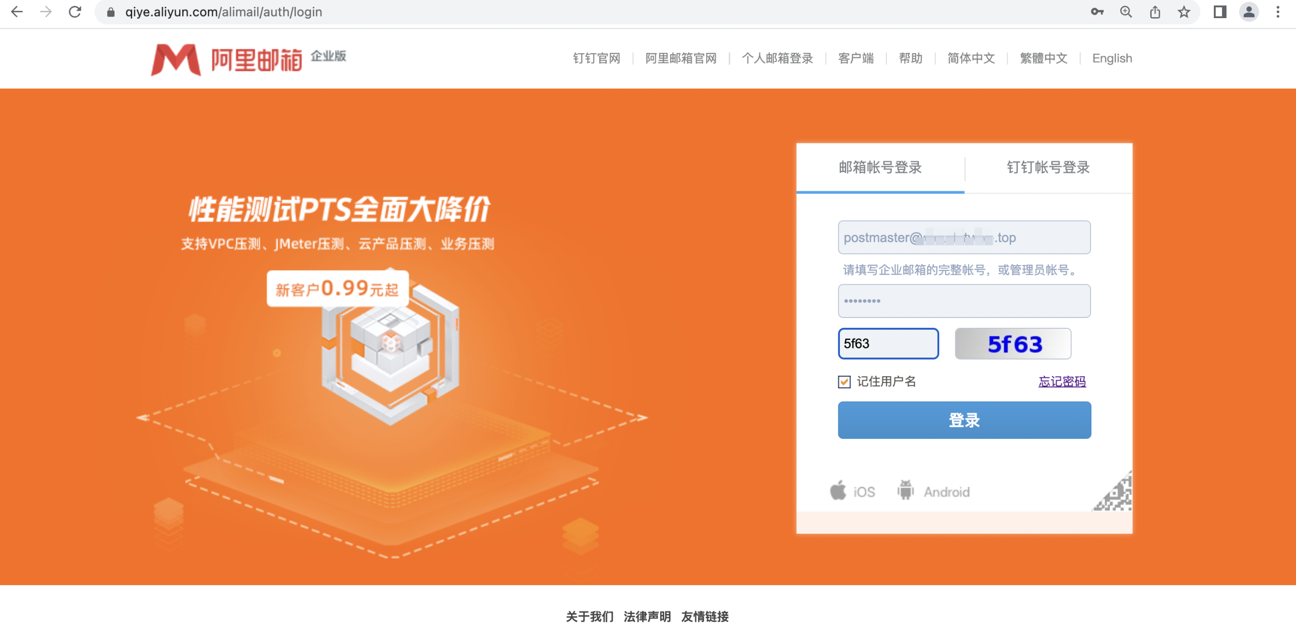 访问:qiye.aliyun.com,使用postmaster@yourdomain.com帐号和密码登入