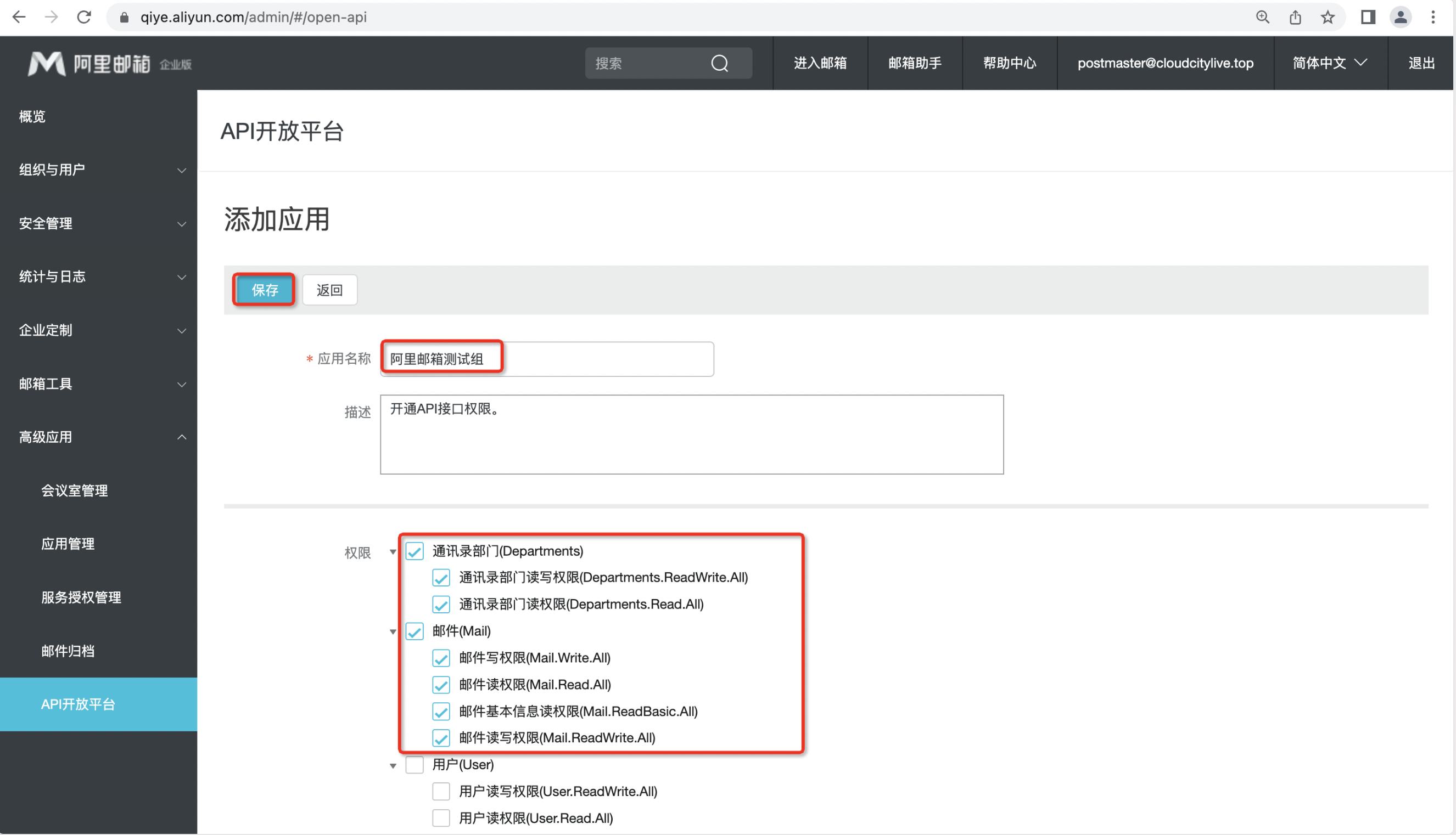 阿里邮箱新版API接口的申请已更新为管理员自助申请啦!原来通过发送邮件方式申请Accesscode&Password的方式变更为邮箱管理员自助即可开通,可极大的缩短API申请用时,管理员自助申请API接口操作如下: