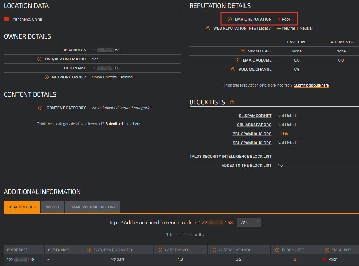 Email Reputation为邮件IP信誉度,Poor表示信誉度较低。