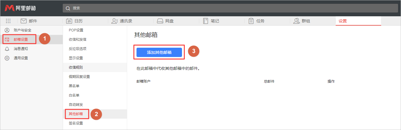 2、在设置页面,选择邮箱设置>其他邮箱,单击添加其他邮箱。