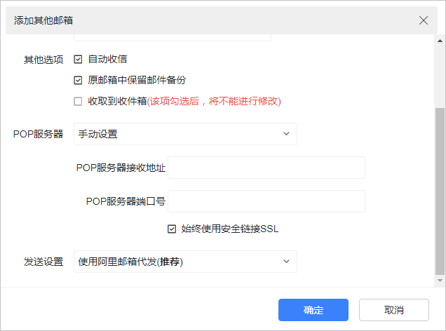 3、在添加其他邮箱窗口中,输入希望代收的邮箱地址、邮箱名和邮箱密码,POP服务器设置自动识别(推荐),发送设置选择使用阿里邮箱代发(推荐),单击确定。