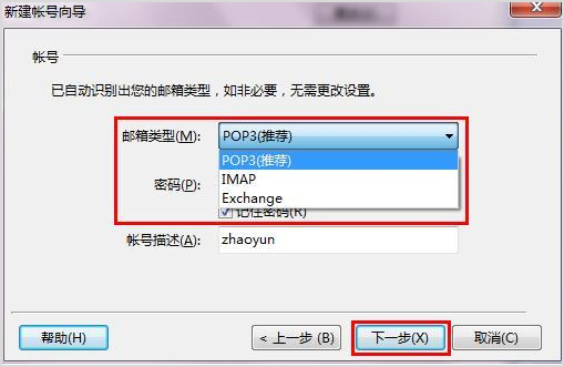 根据实际情况,在邮箱类型中选择POP3或者IMAP,输入密码后,再单击下一步。