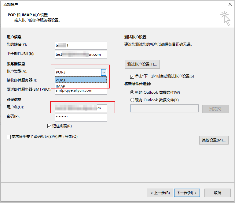 以下是阿里邮箱在Outlook 2010中对POP3和IMAP协议的设置方法: