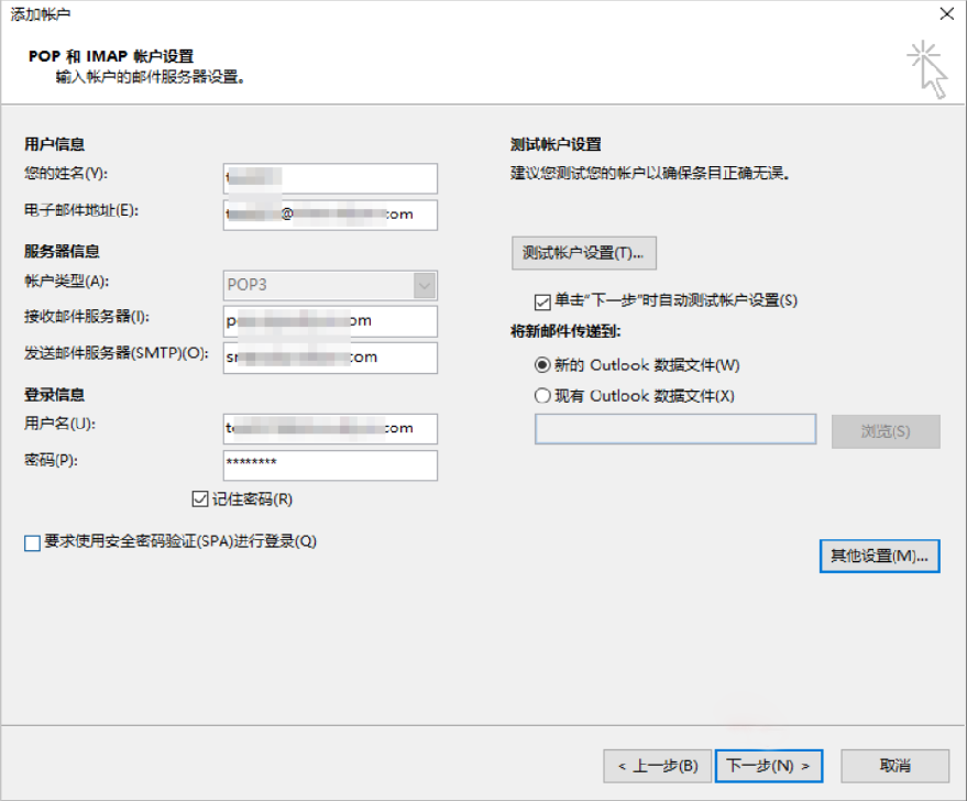 5、填写用户信息、服务器信息、登录信息,填写完成后单击其他设置。下图以填写POP3协议为例。