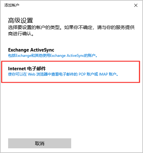 在进行设置前,请确认POP3/SMTP和IMAP/SMTP服务已开启,关于如何开启服务,请参见Outlook和Foxmail中配置阿里邮箱时一直提示密码错误的解决方案。以下是阿里邮箱在Windows 10系统的邮件客户端中对POP3和IMAP协议的设置方法: 1、启动Windows10系统的邮件客户端,在添加帐户页面,单击高级设置。 2、单击Internet电子邮件。 3、在Internet电子邮件帐户页面,输入电子邮件地址、用户名、密码等选项。 说明 建议勾选SSL加密设置,邮件收发更安全。 a. 邮件地址:输入您完整的阿里邮箱地址 (如a***@example.net)。 b. 用户名:输入您完整的邮箱地址(如a***@example.nea***@example.net)。 说明 用户名请输入完整邮箱地址。 c. 密码:输入您的客户端密码。 d. 帐号名:输入邮箱账号。 e. 服务器信息。 接收邮件服务器:pop.qiye.aliyun.com或者pop3.[$Domain]。 发送邮件服务器:smtp.qiye.aliyun.com或者smtp.[$Domain]。 说明 [$Domain]为您想要设置的域名,如果您需要使用自己的域名,需要配置对应的DNS解析,建议您使用阿里邮箱官方服务地址,否则配置无法生效。如何配置DNS解析请参见 阿里邮箱域名解析。 接收邮件服务器:imap.qiye.aliyun.com或者imap.[$Domain]。 发送邮件服务器:smtp.qiye.aliyun.com或smtp.[$Domain]。 4、设置完成后,单击登录,系统显示类似如下,说明设置完成,单击完成即可。详细信息
