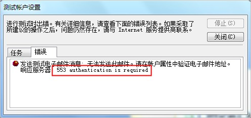 发送测试电子邮件消息:无法发送此邮件。请在帐户属性中验证电子邮件地址。 响应服务器 553 authentication is required