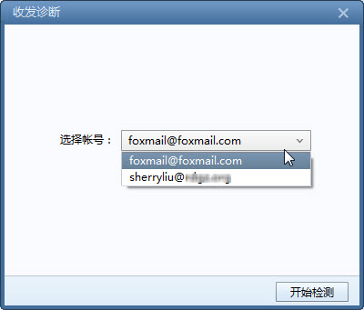 2、在收发诊断工具界面,选择出现问题的邮箱账号,单击开始检测;