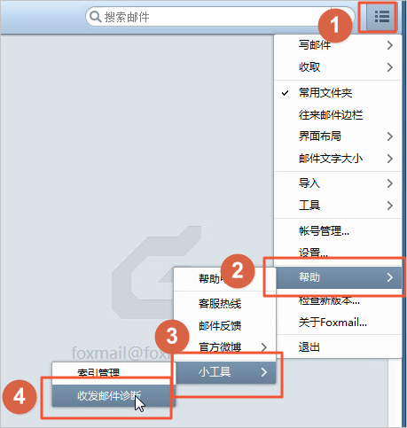 1、在Foxmail主界面,单击右上角的更多菜单,依次选择帮助>小工具>收发邮件诊断;