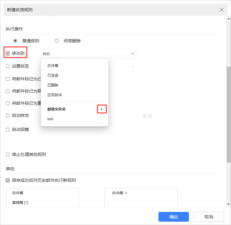 在执行操作区域,勾选移动到,单击相应的选择框右侧的下拉框,在下拉列表中,单击文件夹右侧的添加图标,创建一个用于存放退信的文件夹,并选择相应的文件夹。