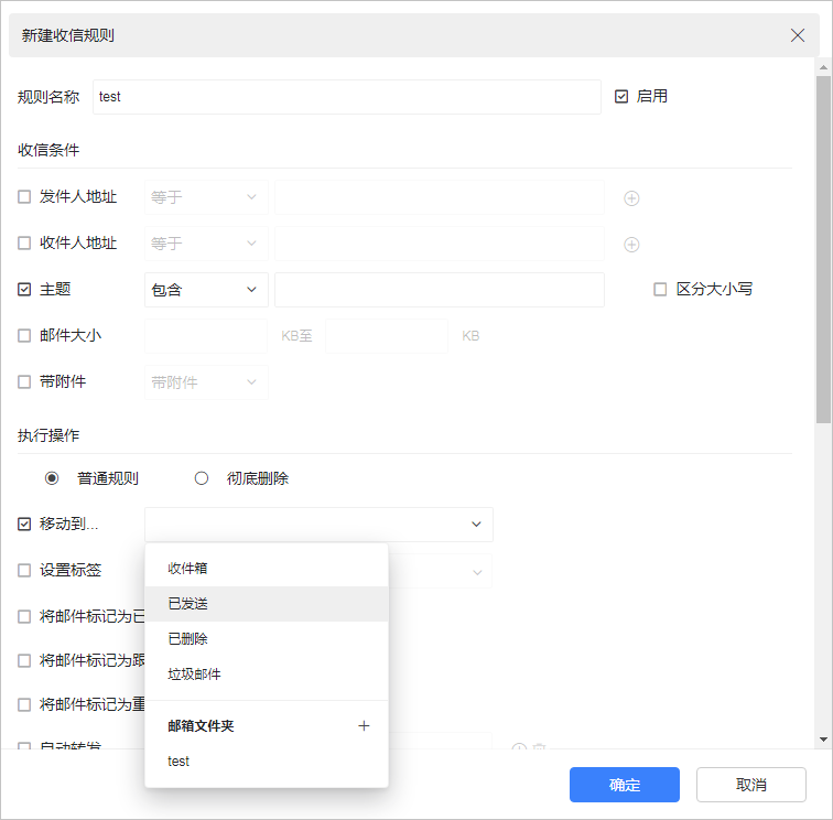 针对收取到的退信邮件,可以参考以下操作设置来信规则,将之前的退信移动至某个文件夹中,以免在收到大量退信时出现找不到正常邮件的情况。