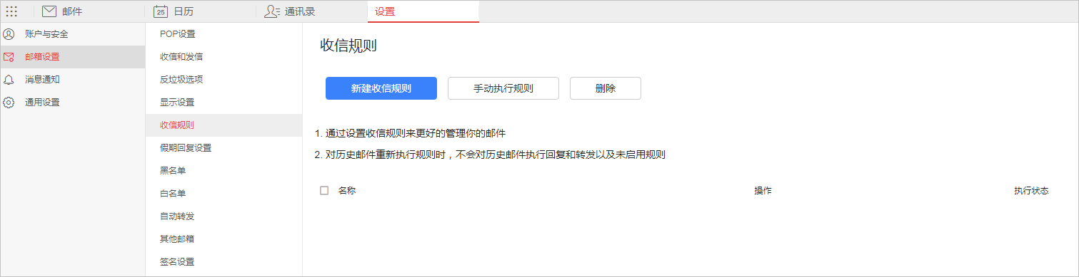 在邮箱的设置页面,选择邮箱设置>收信规则,单击新建收信规则。